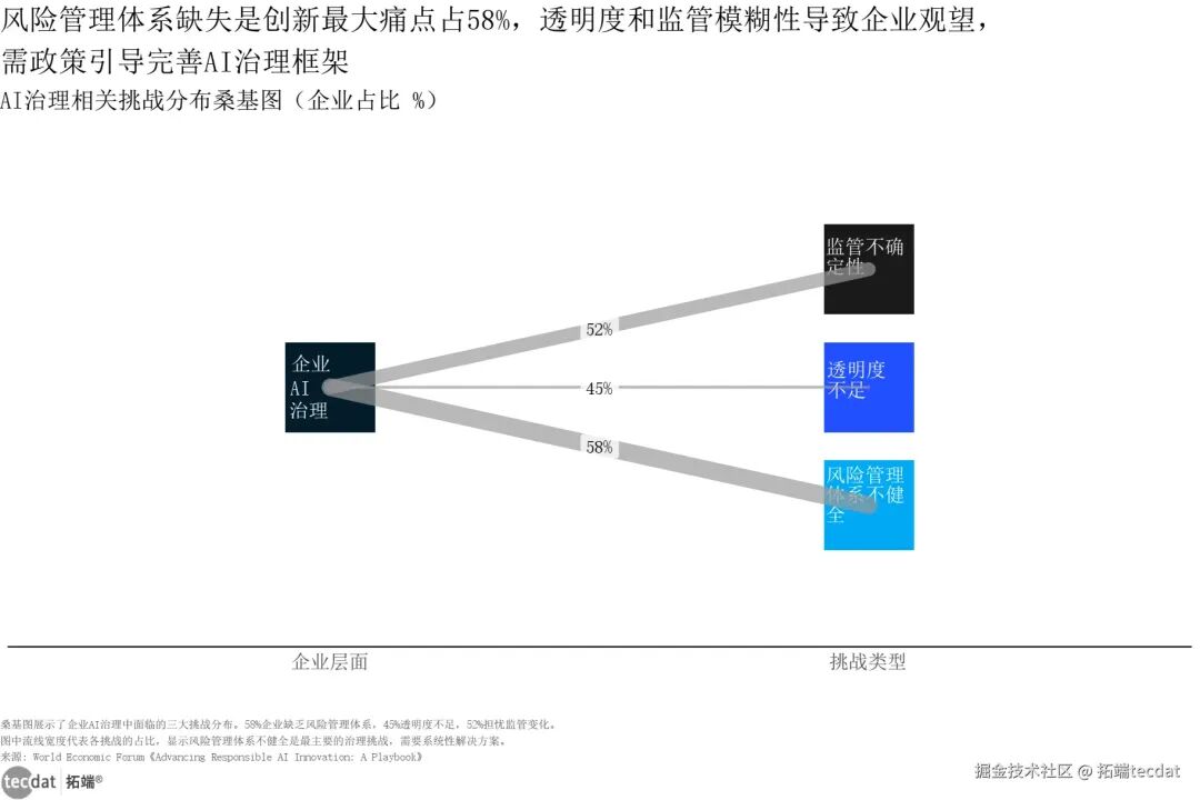 负责任AI实施障碍条形图表14 图表数据及PDF模板已分享到会员群在AI治理体系建设层面,58%的企业存在风险管理体系不健全问题,52%担忧监管不确定性,45%反馈AI透明度不足,治理框架的不完善进一步放大了AI应用的潜在风险。
