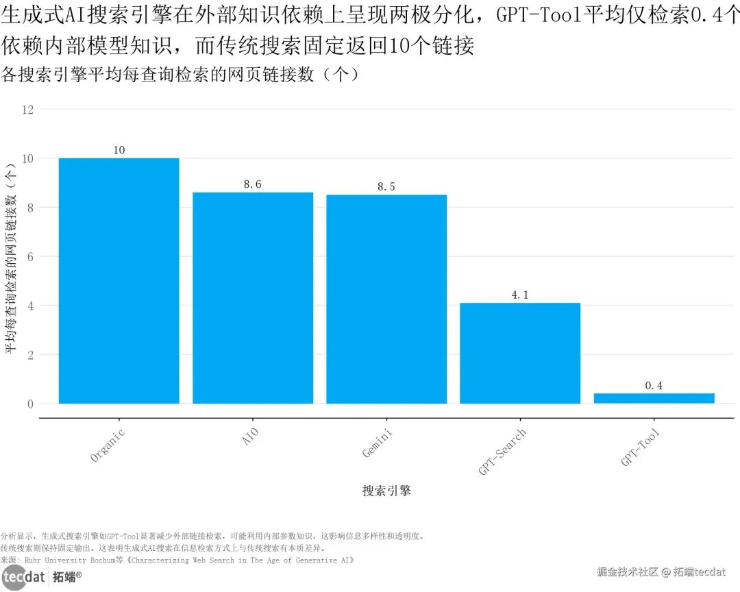 生成式AI搜索引擎与传统搜索引擎在信息检索模式上呈现显著差异:传统有机搜索平均每查询检索10个网页链接,而GPT-Tool仅检索0.4个,过度依赖内部模型知识,导致信息多样性和透明度不足。