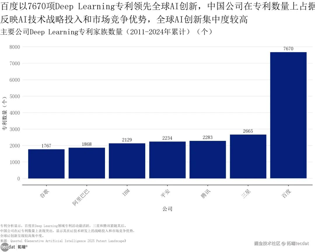 全球AI专利竞争中,中国企业占据领先地位:百度以7670项Deep Learning专利位列第一,三星(2665项)、腾讯(2283项)紧随其后,反映出中国在AI技术研发上的战略投入和专利壁垒优势。