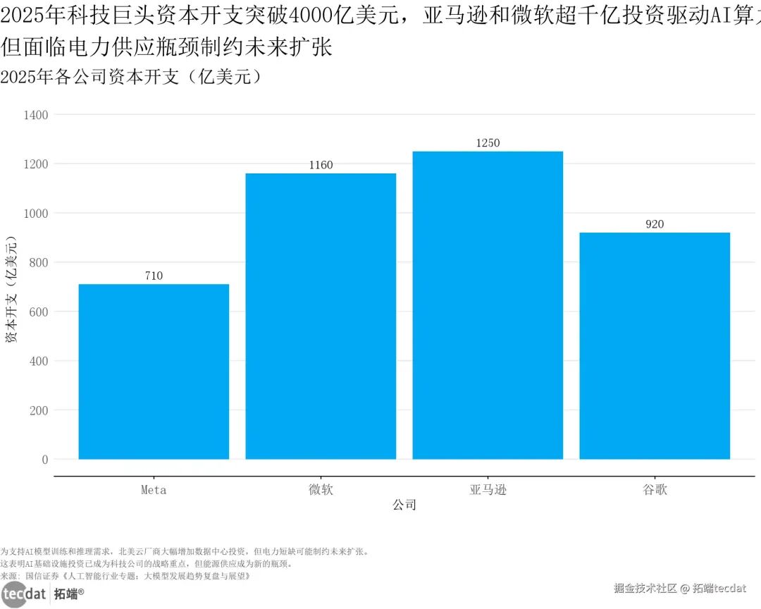 2025年全球科技巨头加码AI算力投资,亚马逊以1250亿美元资本开支居首,微软(1160亿美元)、谷歌(920亿美元)、Meta(710亿美元)紧随其后,总规模突破4000亿美元,但电力供应瓶颈成为算力扩张的核心制约。