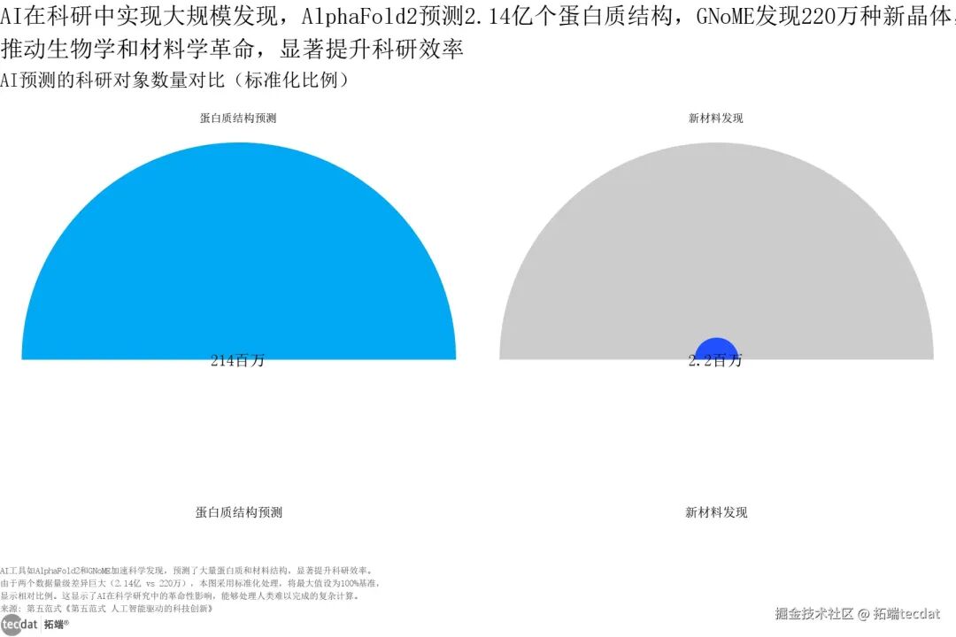 AI在科研领域实现颠覆性突破:AlphaFold2预测2.14亿个蛋白质结构,GNoME发现220万种新晶体材料,大幅提升生物学、材料学的科研效率,推动“AI+科研”模式成为主流。
