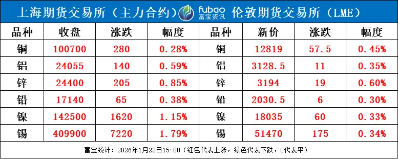 特朗普与北约达成“框架协议”,对欧关税威胁暂缓,市场情绪回暖,今有色金属普涨,其中沪铜主力收涨0.28%;沪铝主力收涨0.59%;沪锌主力收涨0.85%;沪铅主力收涨0.38%;沪锡主力收涨1.79%;沪镍主力收涨1.15%;春节前部分加工厂有赶单的情况,短期市场消费有一定韧性,有色金属走势或止跌企稳。操作上逢低买入。