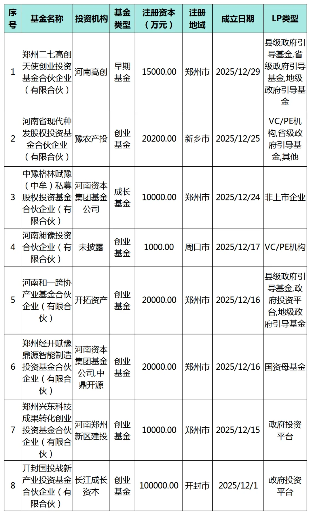 2025年1-12月,河南地区新设80只基金。其中,2025年12月新设基金8只,注册资本总规模19.62亿元,具体明细如下: