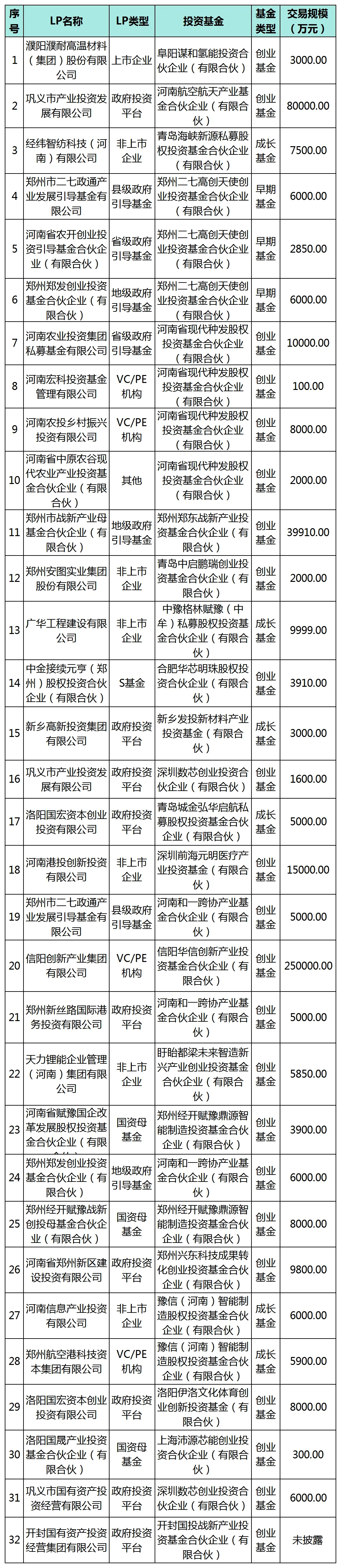 2025年12月,河南地区共有28家LP出资32笔,投向22只基金,LP出资规模52.56亿元(未披露的出资规模不纳入统计)。其中政府类LP出资事件17起,出资规模20.01亿元(未披露的出资规模不纳入统计)。具体交易信息如下:
