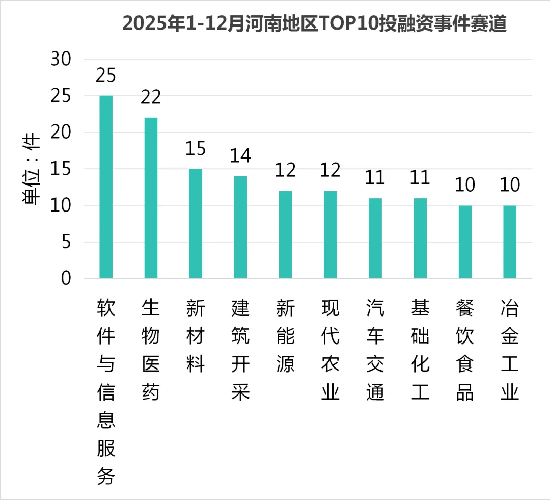2025年1-12月,河南地区共发生234起投融资事件,投资项目217个,估算融资金额为24.41亿元(未披露的投融资金额不纳入统计)。赛道方面,软件与信息服务行业完成融资25笔,占比10.68%,占据行业热门位置;生物医药行业排名第二,完成融资22笔;新材料行业排名第三,完成融资15笔。