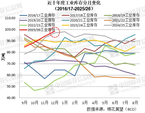 根据本网调查,截至1月中旬国内商业库存总量为586.23万吨,环比上月底增加7.76万吨,同比增加8.33万吨,继续位于历史同期最高位。月度库存同环比均呈现1.4%的增长,而12月和1月也通常是历年度商业库存的高点,考虑到今年总产13%的同比增幅,以及12月和1月外棉和外纱较大量进口增加资源供应,因此后续商业库存仍不排除继续攀升的可能。短期市场资源进入最为充裕的阶段,供应压力略增,而需求则受到春节长假的影响,扩充程度受限,同时新疆棉花减种消息未继续发酵,整体市场供应端略承压。