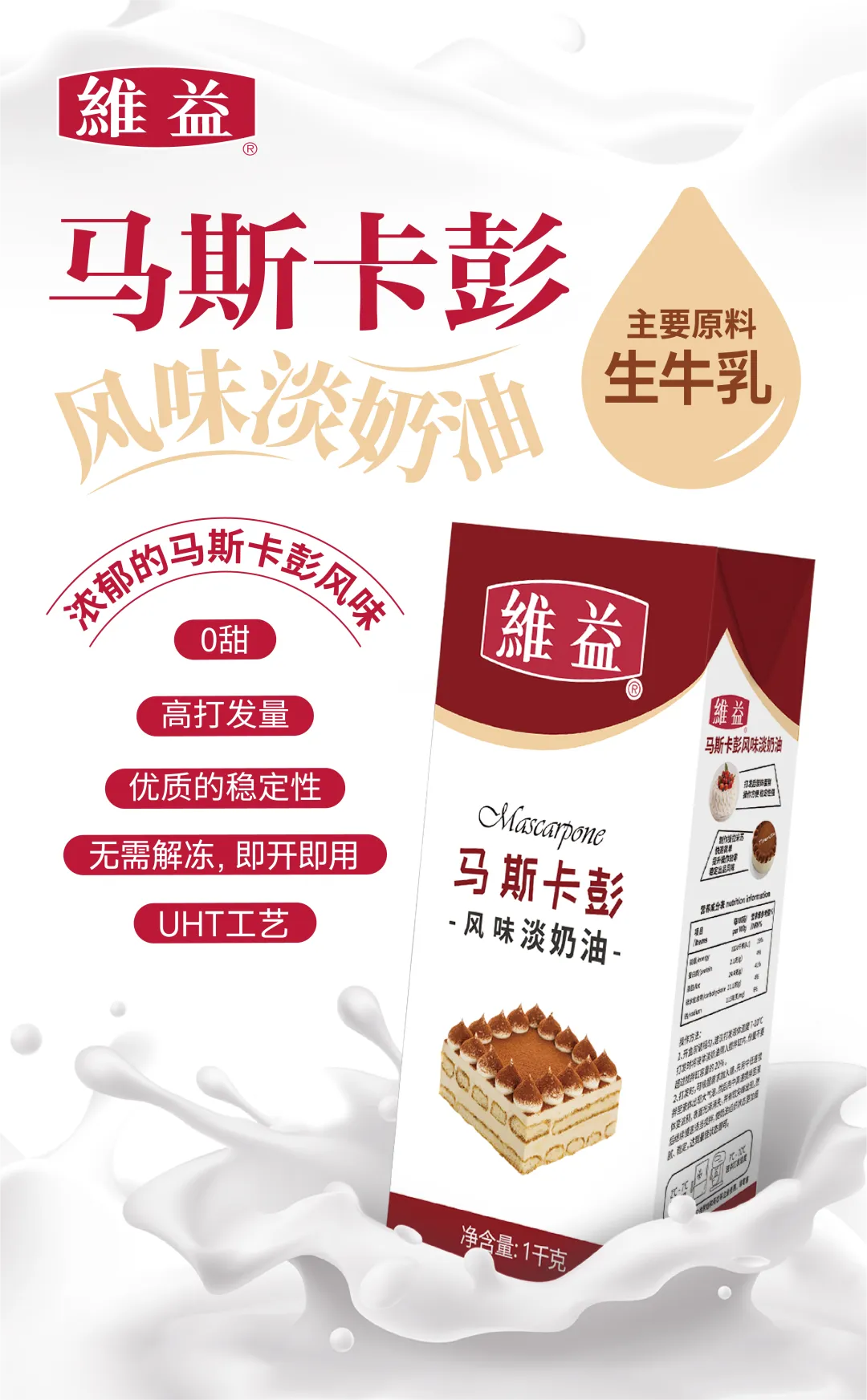 以生牛乳为主要原料,采用UHT工艺,无需解冻,即开即用,同时还兼具0甜度,高打发量,优质稳定性等特点,是替代“马斯卡彭奶酪+奶油”,有效降低成本的绝佳方案。
