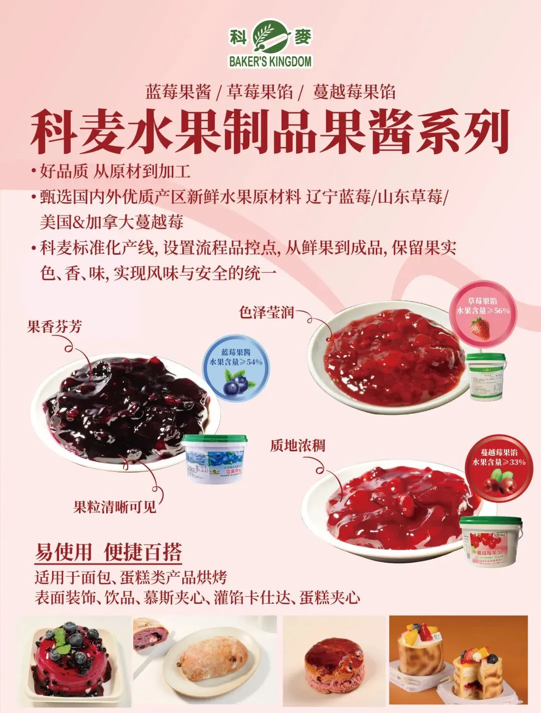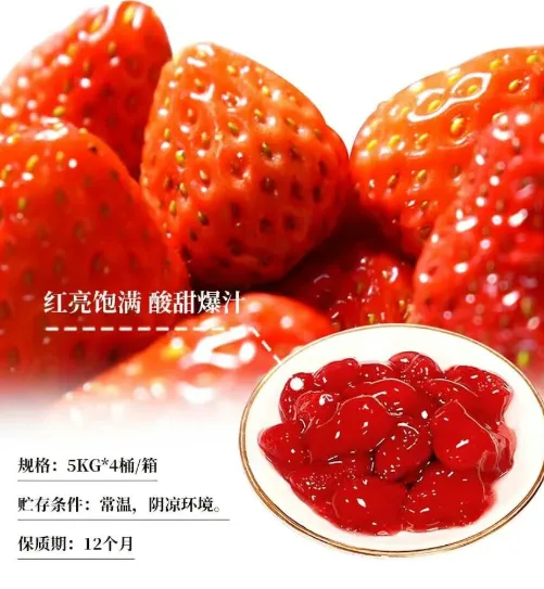 甄选山东草莓,水果含量≥56%,果香饱满,酸甜适中,果肉清晰可见,质地浓醇,色泽莹润;适用于面包、蛋糕类产品焙烤、表面装饰、饮品、慕斯夹心、灌馅卡仕达、蛋糕夹心。