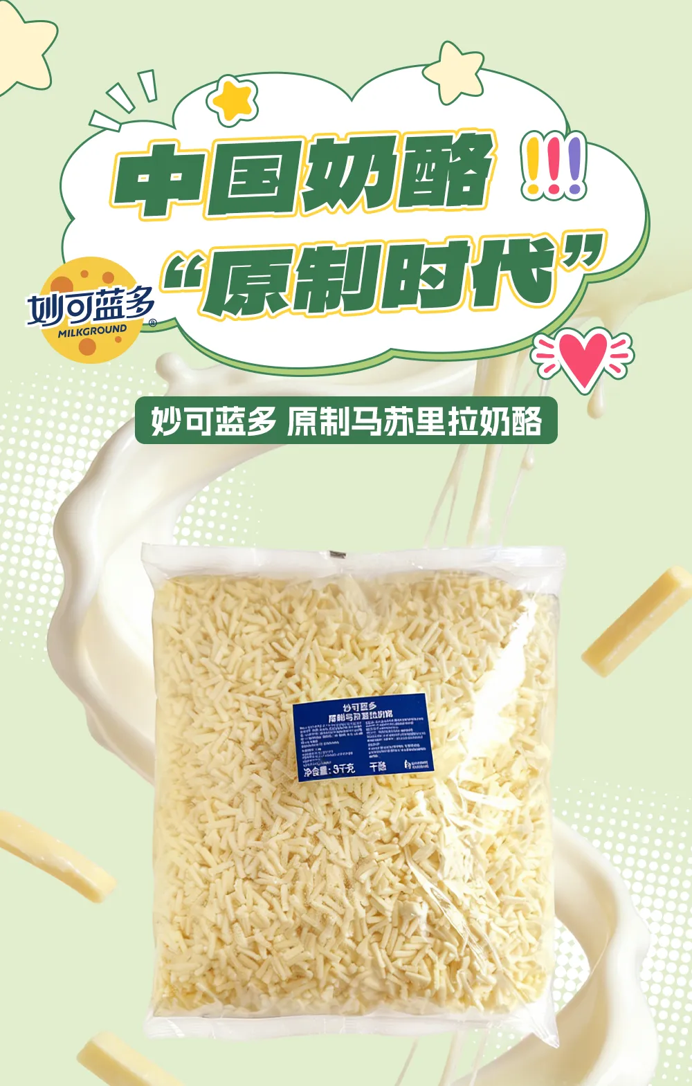 国内首款原制马苏里拉奶酪,每一粒奶酪都单独、均匀、快速冷冻,最大成都保存奶酪的营养和健康,保证奶酪的口感不受任何影响。