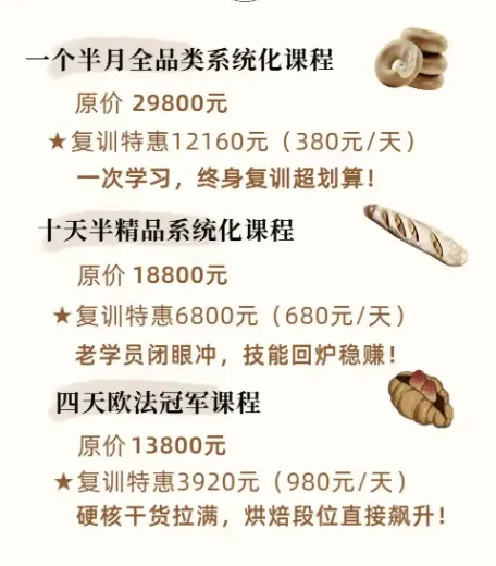 10天半!9大体系!100+款热门面包!一站式满足不同需求!专业理论+全流程实操双结合,小班制教学,高效吃透每一个知识点。所学产品均贴合市场主流,学成即可上架盈利,创业、精进都适配!