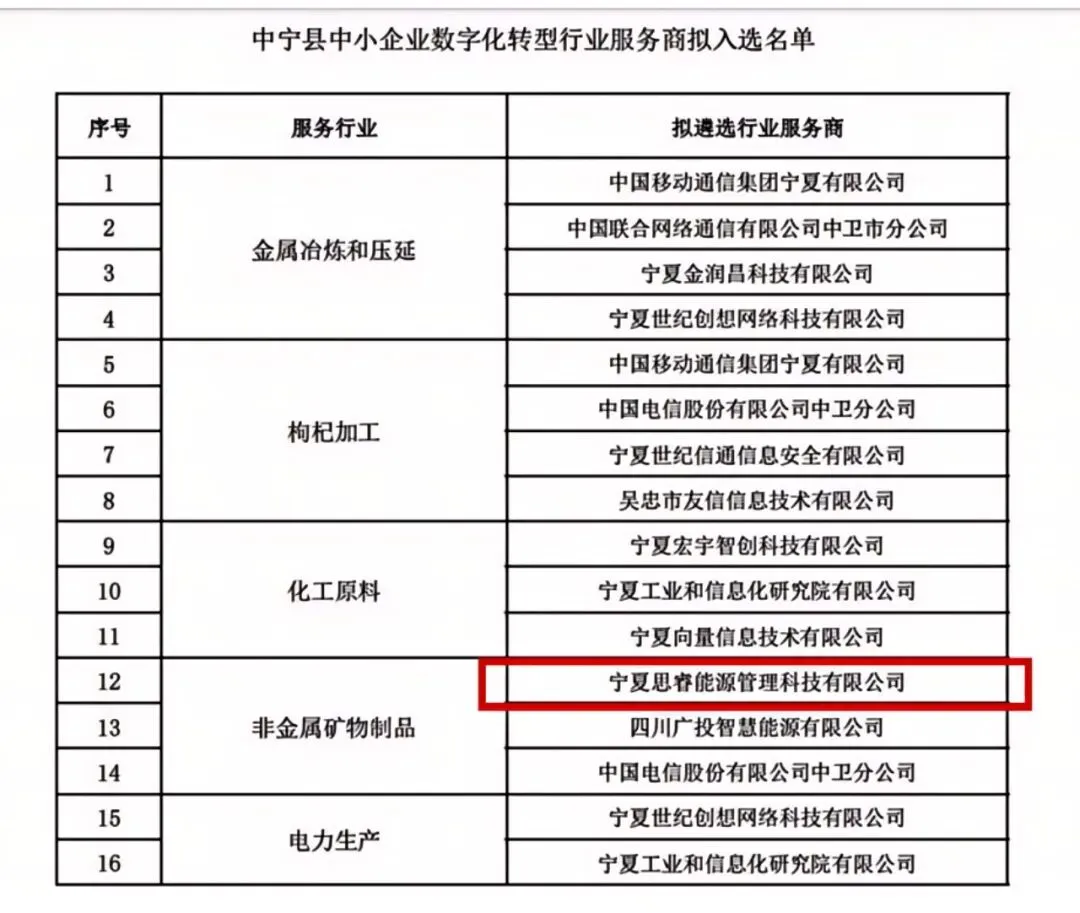 2026年1月21日,中宁县自治区工业和信息化局发布关于中宁县中小企业数字化转型行业服务商拟入选名单的公示,根据评审结果,宁夏思睿能源管理科技有限公司成功入选中宁县中小企业数字化转型行业服务商公示名单。