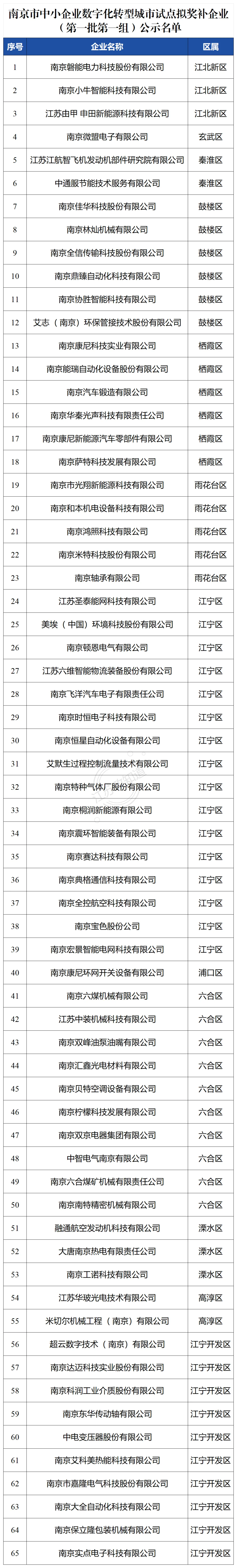 关于南京市中小企业数字化转型城市试点拟奖补企业(第一批第一组)名单的公示