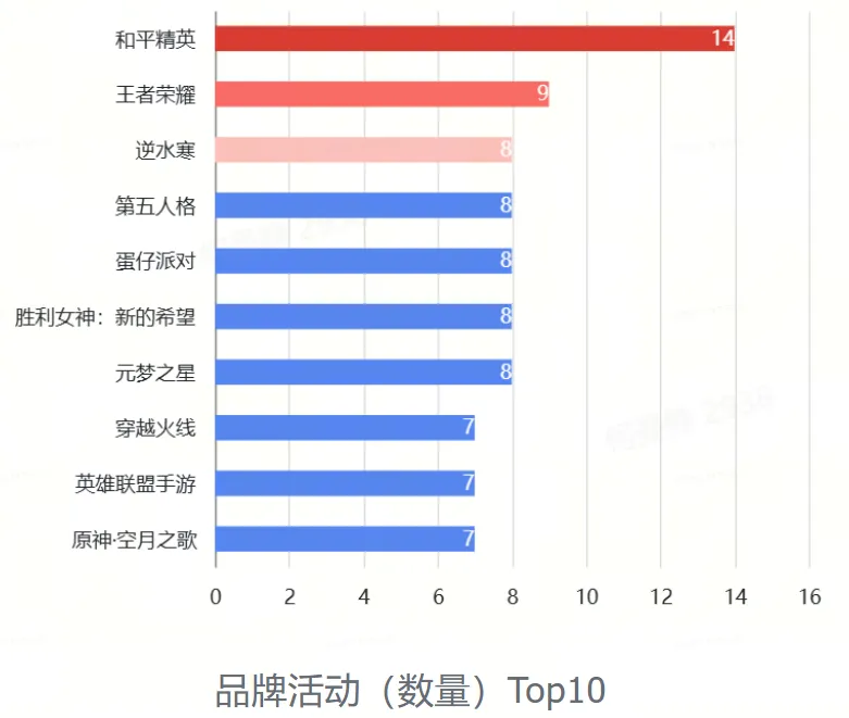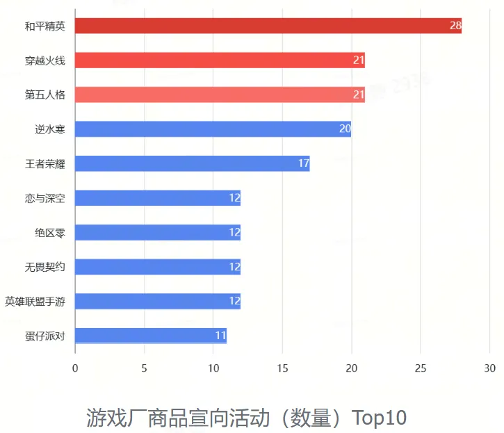 本月数据显示,2025年12月,所选取的129款游戏中,共77款游戏进行了品宣向活动,计418项。整体品宣数量对比上个月的416项处于平稳趋势。其中,《和平精英》《穿越火线》《第五人格》进行品宣向活动次数最多,分别为28次和21次,《和平精英》连续两个月位居品宣活动数量首位。《穿越火线》和《逆水寒》在品宣向活动上发力明显,直冲排行榜前五。《逆水寒》《恋与深空》《绝区零》《无畏契约》为上月未进排行前十,本月进入排行前十的产品。