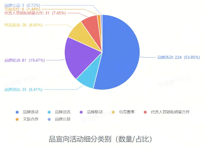 统计显示,2025年12月,游戏厂商品宣向活动仍以品牌活动为主,共224项,占比53.85%;品牌联动81项,占比19.47%;电竞赛事36项,占比8.65%;品牌资讯、代言人营销和明星合作、文旅合作和品牌公益分别为35项、31项、6项、3项,依次占比8.41%、7.45%、1.44%、0.72%。其中“品牌资讯”和“代言人营销和明星合作”较上个月有大幅提升,分别增加了19项和22项。