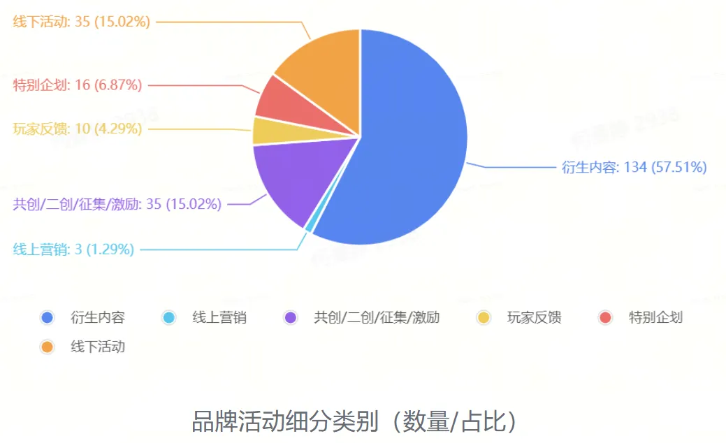 品牌活动中,《和平精英》《王者荣耀》《逆水寒》《第五人格》《蛋仔派对》发布的品牌活动次数最多,分别为14次、9次和8次。活动形式上,游戏厂商通过衍生内容进行品宣向活动依旧占据主流,共134项,占比57.51%;线下活动、共创/二创/征集/激励活动、特别企划活动、玩家反馈活动、线上营销活动分别为35次、35次、15次、10次、3次,依次占比15.02%、15.02%、6.87%、4.29%、1.29%。
