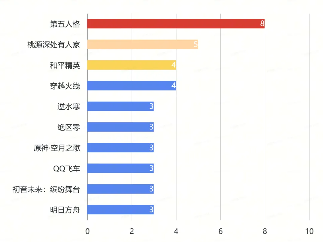 游戏之间的联动排名第三。《王者荣耀》分别与《CF手游》《逆战:未来》进行联动互动,借助周年与新品节点放大射击与MOBA用户的交叉关注。《初音未来:缤纷舞台》与《舞萌DX》《中二节奏》《偶像梦幻祭2》展开多向联动,强化音游与偶像用户生态。《桃源深处有人家》×《奇迹暖暖》则通过风格高度契合的内容联动,放大女性向与治愈系用户的情感认同。