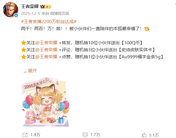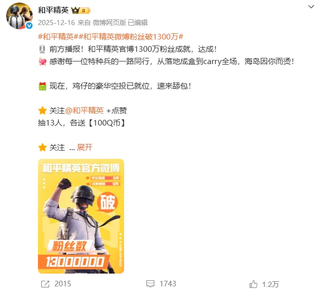 在平台成就方面,头部产品公布里程碑式的社群数据,彰显长期运营厚度。《王者荣耀》达成全平台2200万粉丝成就,彰显了其作为国民级MOBA游戏的社群规模与用户黏性;《和平精英》达成1300万粉丝,直观反映了战术竞技品类在社交平台的活跃度与影响力。