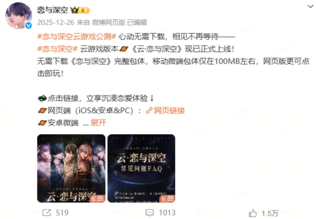 在产品更新方面,技术创新驱动产品形态轻量化,重塑用户触达路径。《恋与深空》宣布“《云·恋与深空》正式上线”,强调移动微端包体仅100MB左右、网页版点击即玩的技术优势,通过云端化、轻量化技术降低体验门槛,实现了从“下载-安装”的传统重路径到“即点即玩”的轻捷路径转换,不仅优化了新用户获取效率,也为产品在跨平台、碎片化场景下的用户留存提供了新的解决方案。