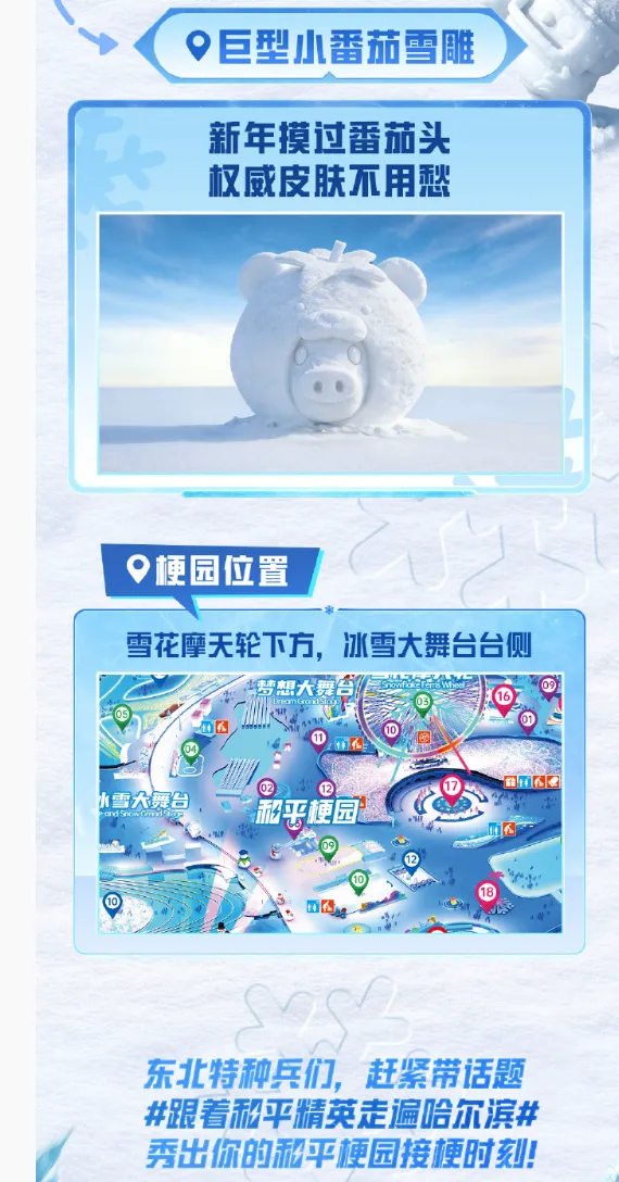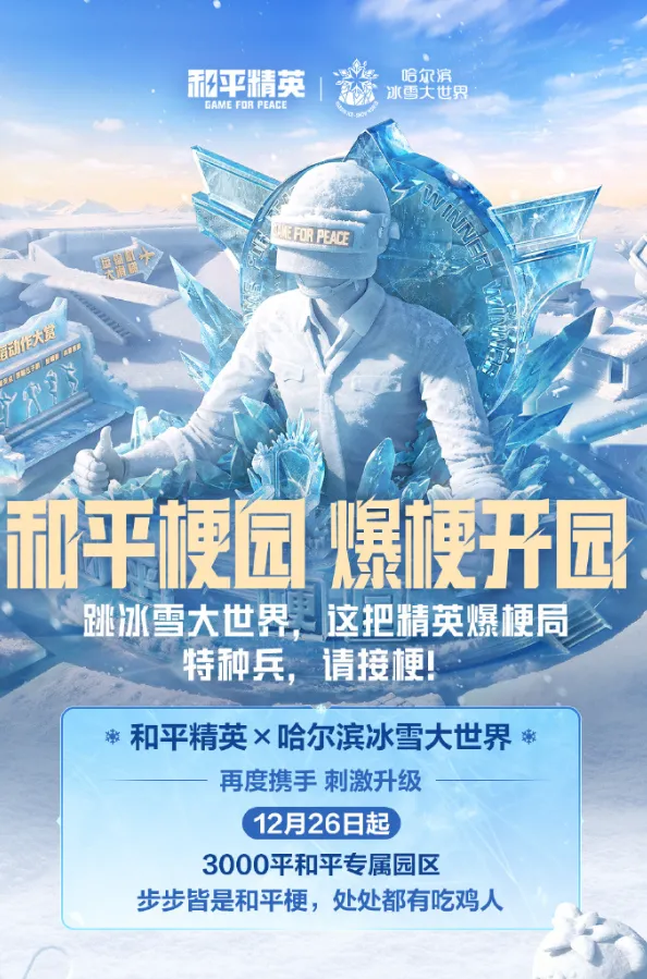 《和平精英》先后与哈尔滨文旅、哈尔滨冰雪大世界展开深度联动,通过“冰雪哈尔滨”主题内容,将城市形象、冰雪文化与游戏 IP 进行系统整合。线上层面,游戏内持续输出冰雪主题内容和场景展示;线下层面,3000 平方米“和平梗园”落地冰雪大世界,并打造城市痛城、打卡装置等实体场景,形成从线上娱乐到线下旅游体验的完整转化链路,进一步放大冬季文旅节点的传播势能。