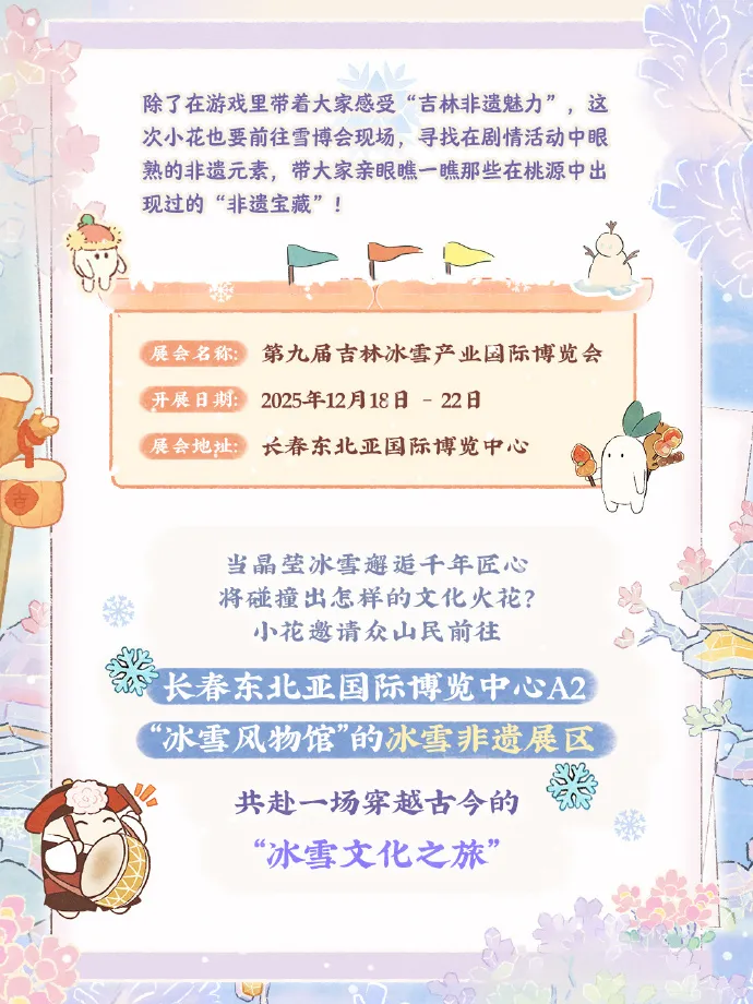 在“游戏 × 文化机构”合作层面,《桃源深处有人家》先后与吉林文旅、吉林雪博会展开合作,通过雪地巡游、冰雪非遗展区联动等形式,将东北地域文化与游戏的田园叙事、非遗表达深度融合,构建兼具观赏性与文化传播属性的线下体验场景,进一步强化其“治愈系国风 IP”的文旅适配度。