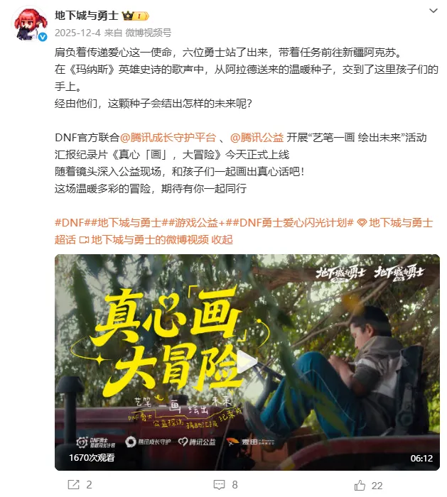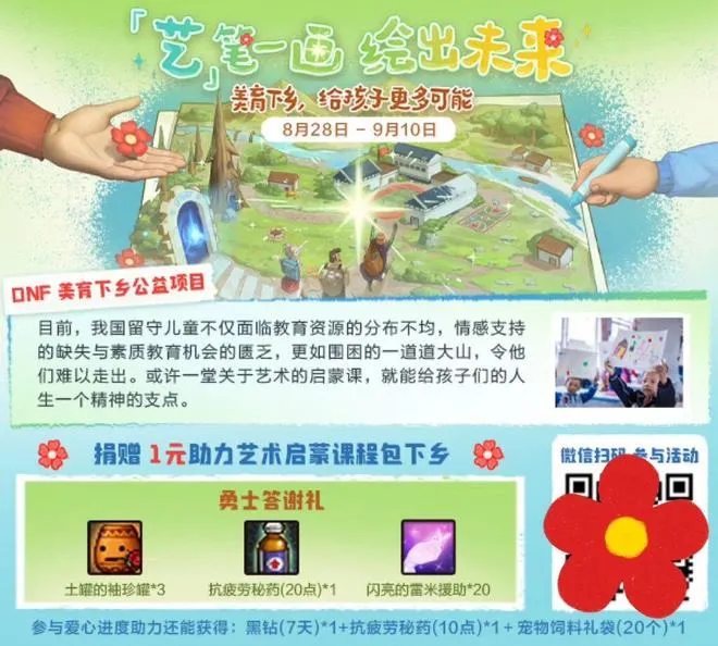 《地下城与勇士:起源》联合腾讯公益发起“艺笔一画·绘出未来”活动,通过游戏连接虚拟世界与现实生活,为乡村儿童提供宝贵的艺术启蒙资源与支持。 玩家只需在游戏内“点亮”乡村儿童的画作,或是进行1元的小额捐赠,就可以为公益进度条积累“爱心值”。当全服玩家共同努力使进度条达成目标后,DNF官方会以全体玩家的名义,通过腾讯基金会追加捐赠,为更多乡村青少年提供接受艺术教育的机会。此次活动共有超过200万玩家参与互动,近百万玩家进行了爱心捐款,全服累计点亮画作超过1002万次,玩家的爱心与官方的投入汇聚成约200万元的公益资金。可观的数字背后,每一份善意都正在转化为切实、落地的公益行动,这种“长期追踪 + 及时反馈” 的模式,将公益的每一步都呈现在玩家面前,让每一位玩家都能共同见证与参与这场关于“美与责任” 的长期旅程。