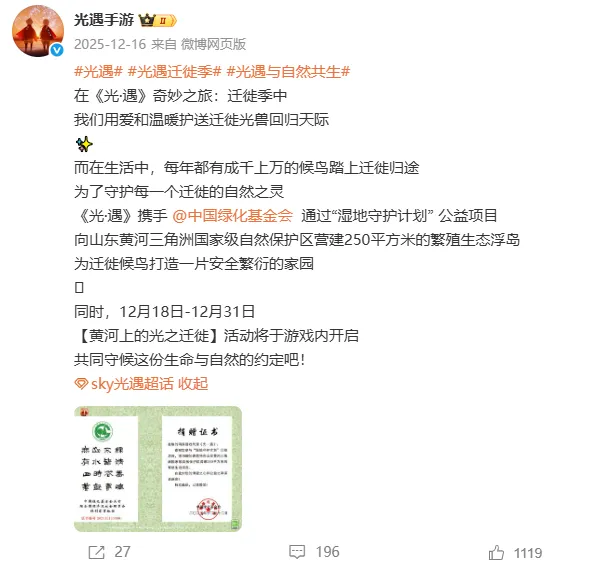 《光·遇》与中国绿化基金会合作开展的“湿地守护计划”。这是一项聚焦湿地生态与生物多样性保护的长期公益项目。该项目将游戏机制与现实环保行动相结合,通过数字力量引导年轻玩家关注并参与自然保护。在游戏内,《光·遇》推出了“迁徙季”及相关活动,玩家可以通过完成任务、收集物资等方式参与虚拟的湿地守护。在线下,双方合作在山东黄河三角洲国家级自然保护区落地了实质性保护工作,具体包括营建250万平方米的繁殖生态浮岛、建设700亩朱鹮栖息地等。这种“游戏+公益”的创新模式,将玩家在云端的善意转化为守护地球生命的坚实力量,生动诠释了数字时代下企业与公众共同参与生态保护的新范式。