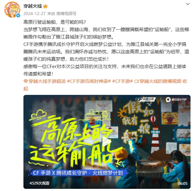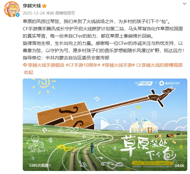 《穿越火线》(CF)手游与腾讯成长守护平台联合发起的“火线燃梦计划”是一项旨在通过数字科技赋能偏远地区青少年教育与美育发展的长期公益项目。该项目在11月启动后,于12月24日落地内蒙古完成第二站,持续聚焦“乡村孩子音乐教育”这一方向。通过游戏内的“一元助力乡村音乐启蒙计划”,以低门槛方式动员玩家参与捐赠,将射击游戏的“热血”精神转化为支持梦想成长的温暖力量,将游戏从单纯的娱乐体验转变为凝聚社会爱心、传承民族文化的平台,让千万玩家成为公益的参与者与见证者。