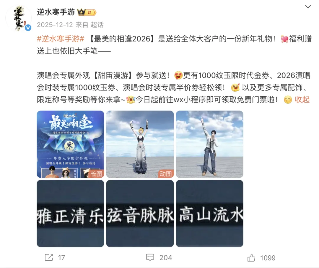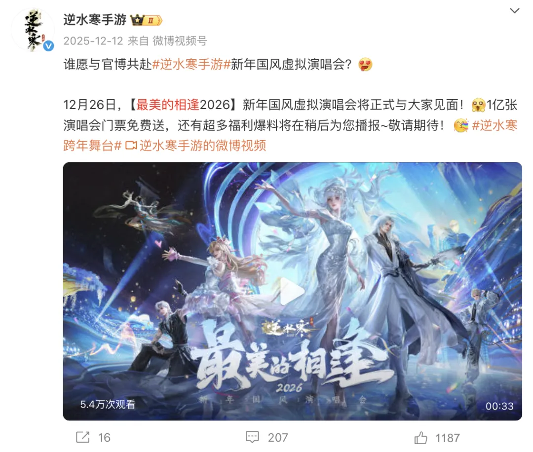 从12月初的定档官宣、节目单预告,到免费门票与外观福利释放,再到多位国家级、行业级艺术家的密集参与,《逆水寒》并未将演唱会仅作为一次年末庆典,而是将其升级为一次品牌价值集中展示的“年度文化事件”。