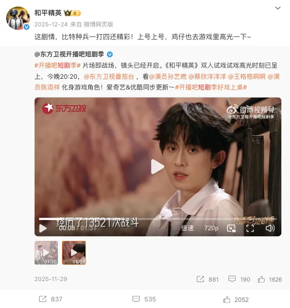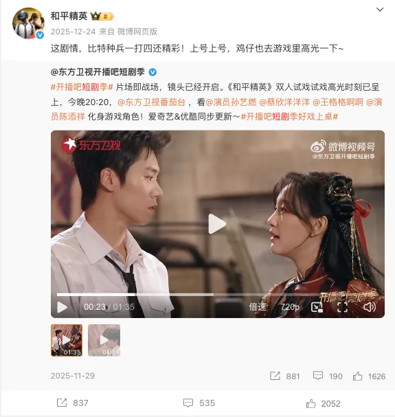 在内容形态上,《开播吧短剧季》本身兼具综艺节奏与短剧结构,为《和平精英》提供了高度适配的传播容器。“片场即战场”的核心概念,与游戏世界观形成天然呼应;而“双人试戏”“高光片段释出”等内容节点,则被拆解为适合社交平台传播的短内容单元,实现从电视端到长短视频平台的多层扩散。这种结构使品牌曝光不依赖单一爆点,而是通过多个可二次传播的内容切片,持续强化用户对《和平精英》的认知记忆。
