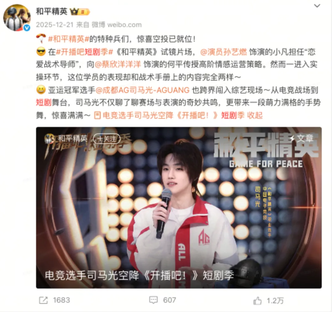 对《和平精英》而言,这不仅拓展了电竞选手的传播场景,也进一步丰富了品牌的人物谱系,使“特种兵”不再局限于赛场或游戏内,而是具备进入泛娱乐语境的可能性。