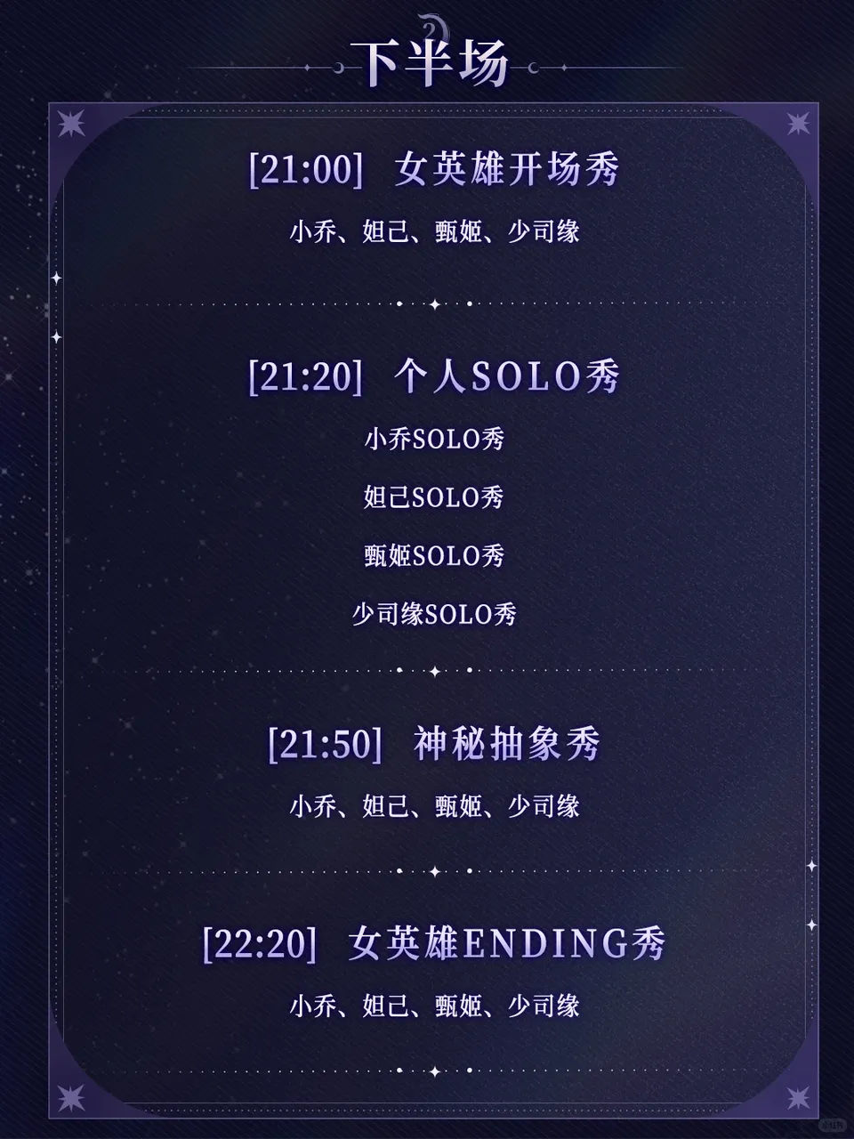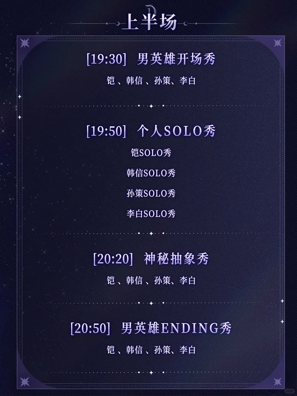 在团播节目内容结构的设置上,王者英雄团播夜通过群体舞蹈、互动环节与SOLO的分组呈现,通过开场、神秘抽象秀环节和ENDING秀来强化“英雄团体”的整体记忆点,同时通过SOLO秀来突出单角色的个人魅力。这种群像化+个人特色呈现,有效降低了单角色持续表演的审美疲劳的风险,也为后续不同英雄组合、轮换登场提供了扩展可能,同时能够为内容的二次传播提供更多的噱头。