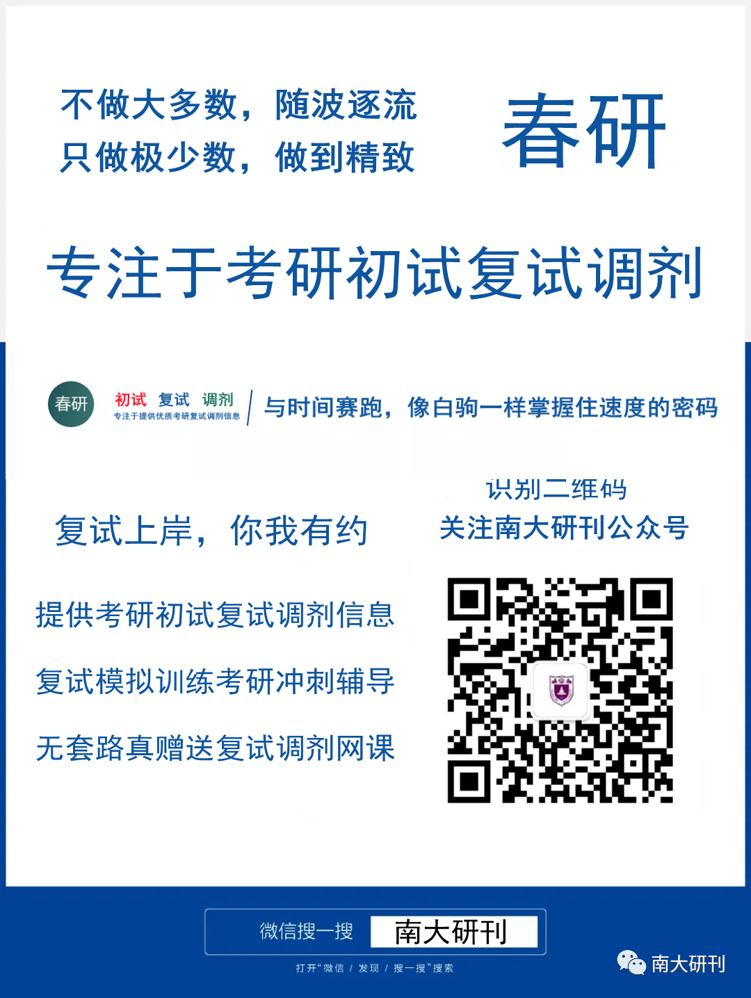 南大研刊微信公众号,专注于南京大学考研,愿意提供更多考研公益信息!助力于南京大学考研小伙伴成功上岸,我在南京大学等你!为了方便大家沟通交流建了一个南京大学考研导师信息QQ群:816421937 ,相关南京大学考研问题亦可加我微信号:ymmbbbb 答疑