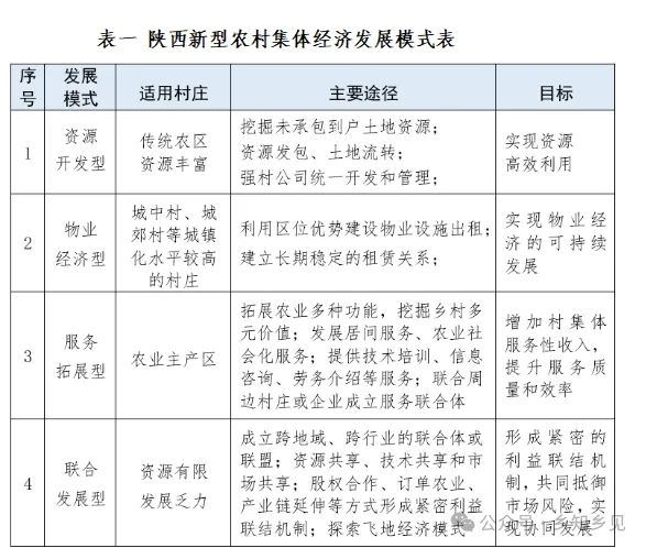 (二)探索多元化发展模式,创新运营机制。一是遵循“因地制宜、多元化发展”原则。结合陕西不同区域的自然资源、地理位置、产业基础及市场条件,探索差异化新型农村集体经济发展模式(见表一)。二是创新农村集体经济运营机制。深化政府引导的市场化合作,推动形成“支部引领、企业带动、合作社组织、农户参与”的产业化体系,通过有偿服务与合理分红,既壮大集体经济,又确保农户稳定增收。完善农业社会化服务,构建科技推广、农机农资、信息服务体系,提升生产效率和产品质量。加强合作社与劳务中介服务,为农民提供组织化、专业化服务,如集中采购农资、销售农产品及就业服务,增强农村集体经济的联农带农能力。三是探索多元合作模式,构建村镇区域协同发展框架。促进跨地域合作“抱团共进”,依托镇级平台成立强村公司,整合全产业链服务,深化资源共享与优势互补。清晰界定政企角色,强化农村集体经济统筹效能。
