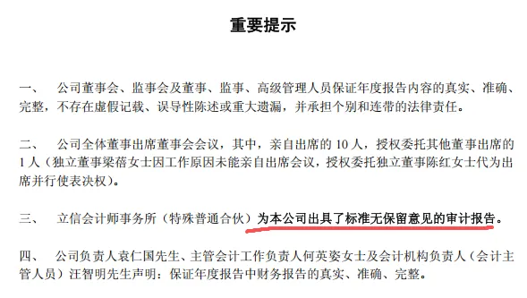 筛选公司的第一步,就是打开财报的扉页,首先映入眼帘的就是重要提示。这页很短,但是也有一个非常重要的重点,就是审计报告的意见。