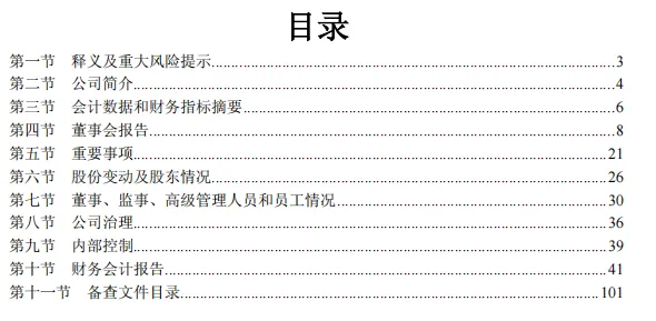 目录显示这份财报分十一个章节,重要内容只有三个:财务会计报告,董事会报告和重要事项。在这三节中,核心内容是财务会计报告的三张表和附注内容。