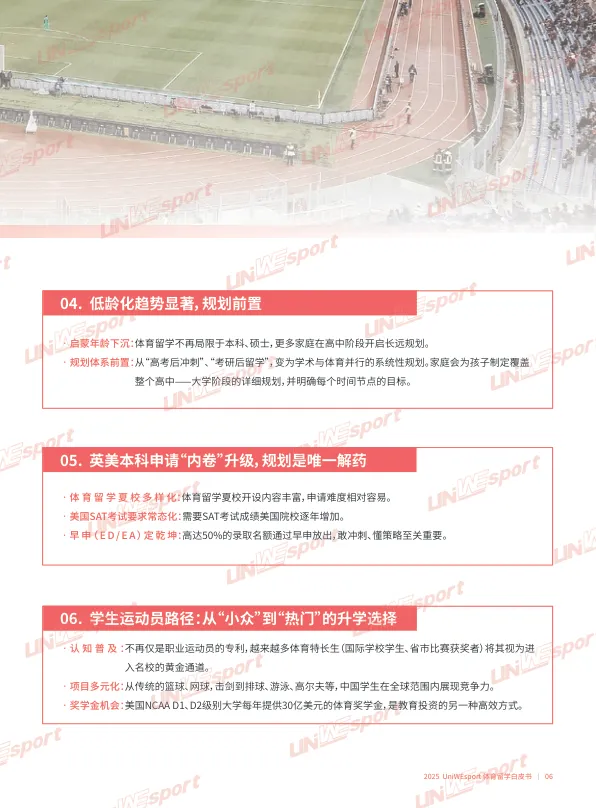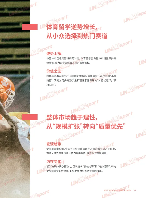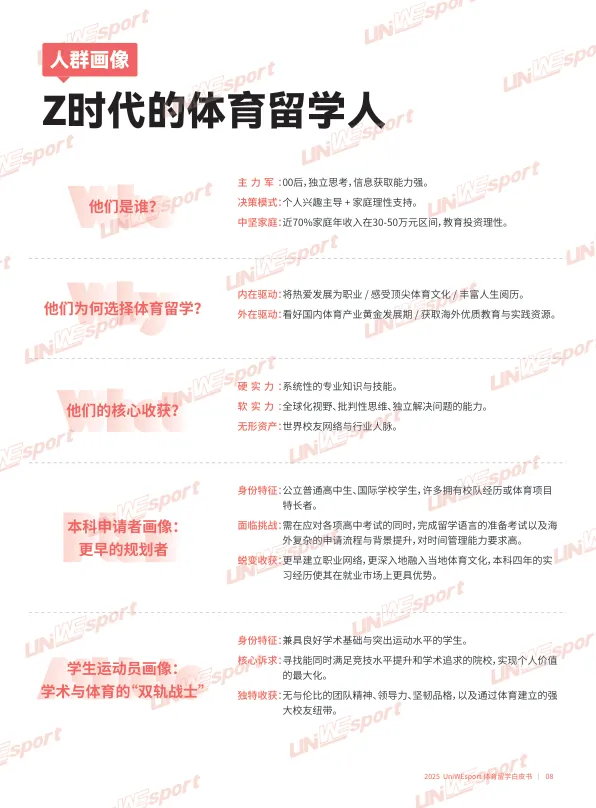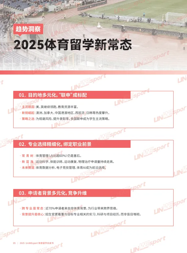 - 逆势增长:与整体留学市场趋于理性不同,体育留学咨询量和申请量保持高速增长,成为最具活力的细分赛道。