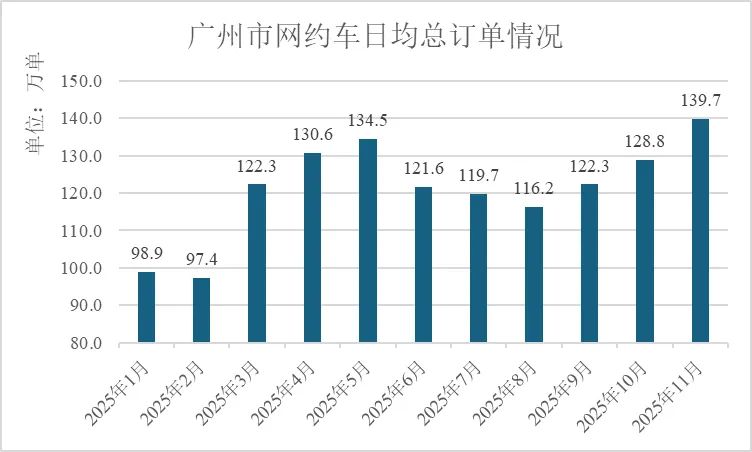 (一)市场总量。根据广州市交通运输局公布网约车数据显示,2025年全市网约车日均总订单数量除1月和2月外总体较为稳定,2025年订单数量高峰期位于4月、5月和11月。