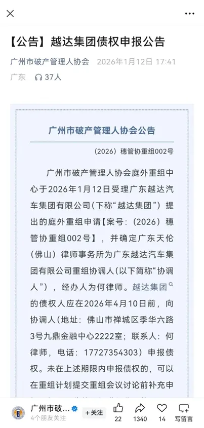 广州市破产管理人协会庭外重组中心于2026年1月12日受理广东越达汽车集团有限公司(下称“越达集团”)提出的庭外重组申请。该公司2019年3月成立于广州市白云区,短短六年时间从零起步,迅速成长为拥有2万辆可供出租车辆、资产规模约18亿元,2024年,越达营收达3亿元,2025年8月已实现2.5亿元。前期的高速扩张,到如今面临着破产重组。