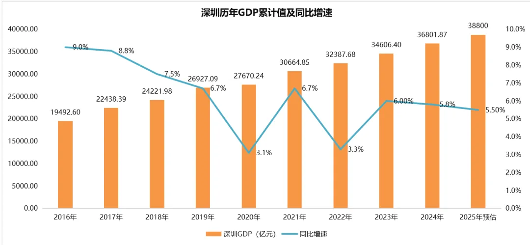 预计2025年全年年深圳GDP超3.88万亿元,同比增长约5.5%(预计)。