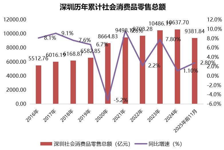 ► 2025年前11月,全市社会消费品零售总额9381.84亿元,预计全年超1.1万亿;