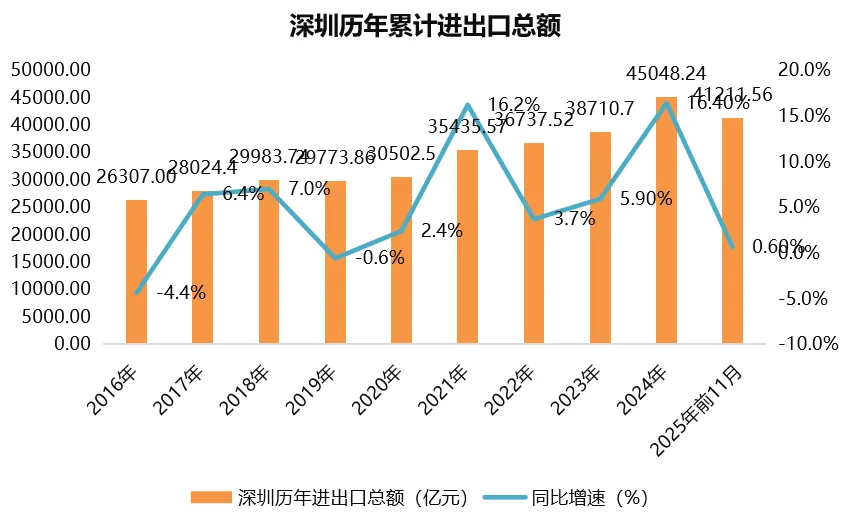 ► 2025年前11月,全市进出口总额41211.56亿元,预计全年超4.5万亿,与去年持平,同比增速大幅下降,主要是受中美贸易战影响。