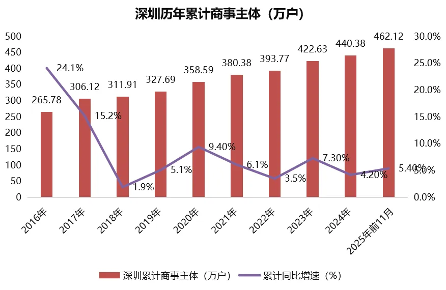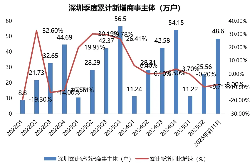 ► 截至2025年11月,全市累计新增48.6万户商事主体,同比下滑8%;
