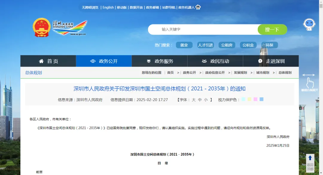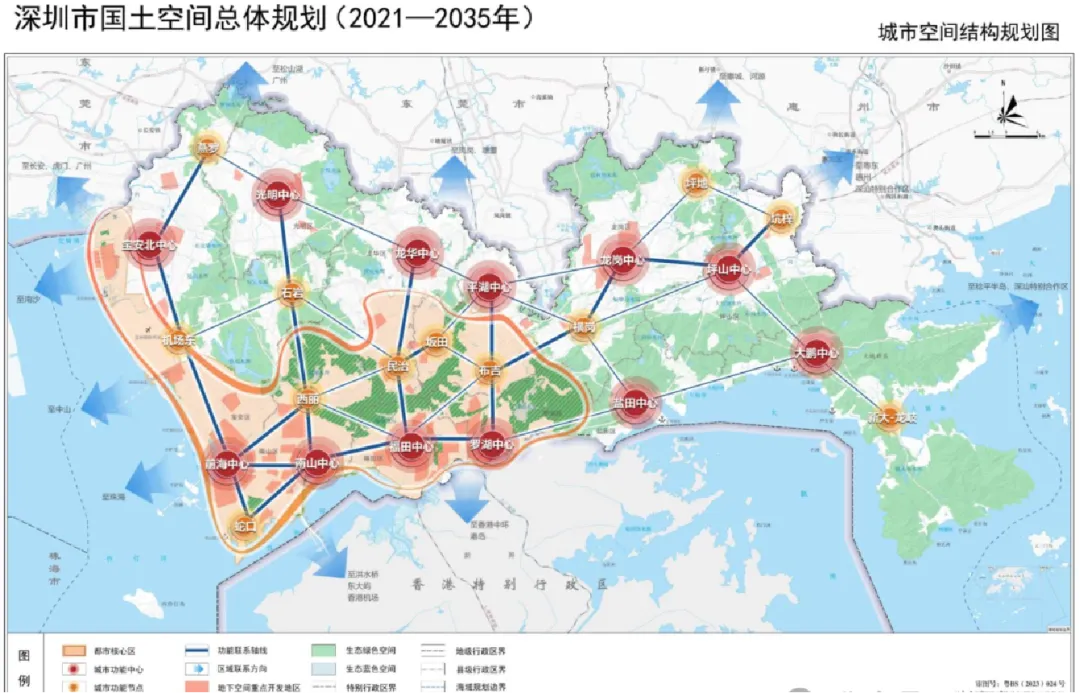 深圳市人民政府关于印发深圳市国土空间总体规划(2021-2035年)的通知。本规划基期为2020年,规划期限为2021-2035年,近期到2025年,远景展望到2050年。《总体规划》明确,深圳市的城市性质为经济特区、国家创新型城市、现代海洋城市、国际性综合交通枢纽城市。《总体规划》提出: