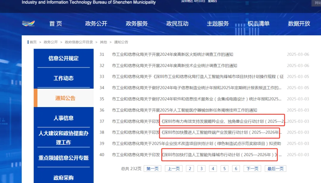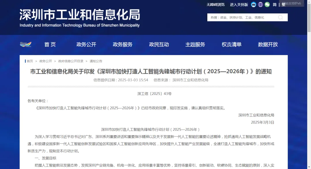 3月3日,深圳日发四份行动计划,分别涉及人工智能先锋城市、人工智能终端产业、具身智能机器人与瞪羚企业独角兽企业。深圳以清晰的路线蓝图为指引,加快打造具有全球重要影响力的产业科技创新中心,全方位深层次建设创新之城。