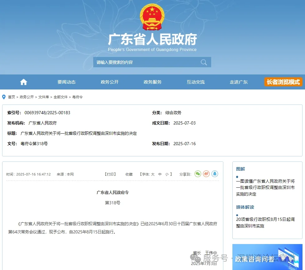 广东省下放20项省级行政职权由深圳实施,自2025年8月15日起施行。