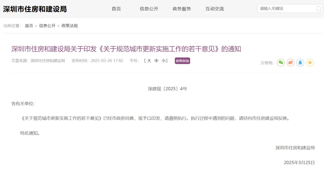 ► 3月26日市住房建设局印发了《关于规范城市更新实施工作的若干意见》将加强计划统筹管控除工改普通工业以及以建设保障性住房为主的以外审慎新增城市更新单元计划。自2025年4月9日起施行,有效期3年。
