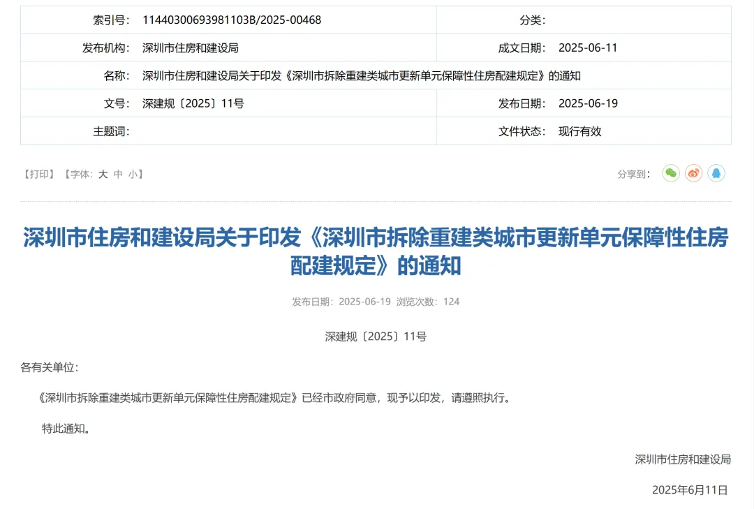 6月19日,深圳住建局发布《深圳市拆除重建类城市更新单元保障性住房配建规定》(以下简称规定),将于6月24日起实施。