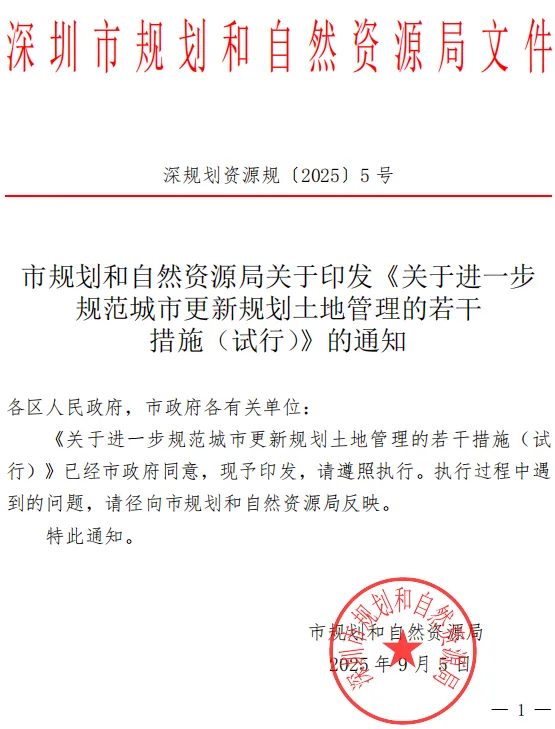 9月18日,深圳市规划和自然资源局印发《关于进一步规范城市更新规划土地管理的若干措施(试行)》(深规划资源规〔2025〕5号)(下称“若干措施”),提出三大突破: