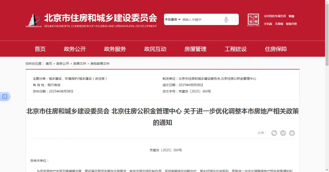 8月8日,北京市住房和城乡建设委员会、北京住房公积金管理中心联合印发《关于进一步优化调整本市房地产相关政策的通知》(以下简称《通知》),自2025年8月9日起施行。