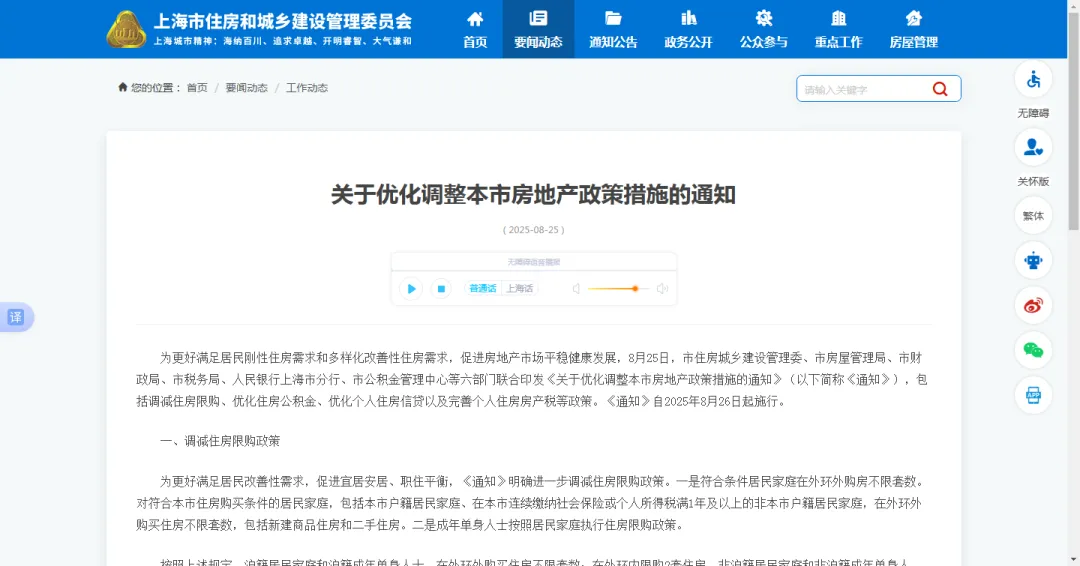 8月25日,上海市住房城乡建设管理委、市房屋管理局等六部门联合印发《关于优化调整本市房地产政策措施的通知》,涉及住房限购、公积金、住房信贷、住房税收等6项调整。新政自2025年8月26日起施行。